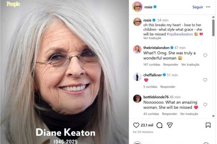 Bette Midler, que atuou com Keaton em Clube das Desquitadas, compartilhou uma foto antiga da colega e lamentou profundamente sua partida. “Brilhante, linda e extraordinária. Ela era hilária, única e completamente livre de malícia. O que se via na tela era quem ela realmente era”, escreveu.