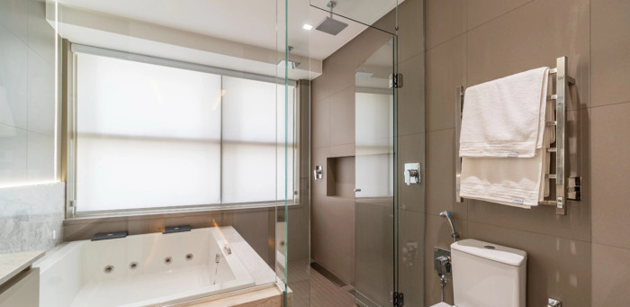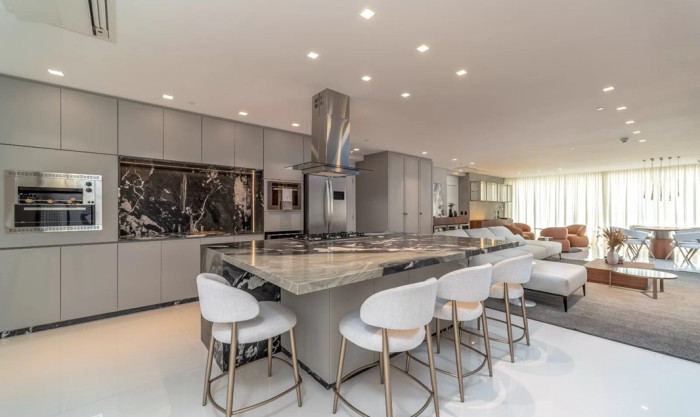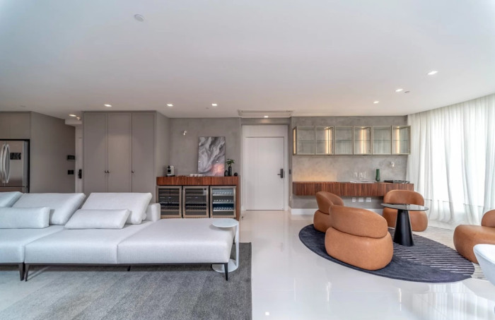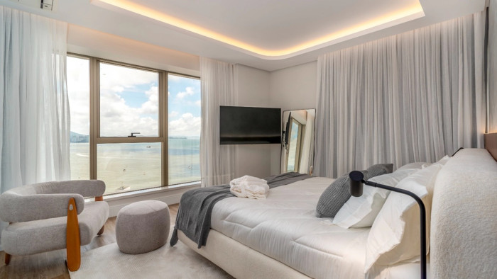 Com 265 metros quadrados de área privativa, o apartamento oferece três suítes, sendo uma suíte master de 50 m², com banheira de imersão, sauna úmida e closet sob medida. As duas suítes adicionais possuem vista panorâmica para o mar e para as montanhas. O imóvel conta ainda com tecnologia de ponta, com sistema Control4 que proporciona automação total de iluminação, som e climatização.