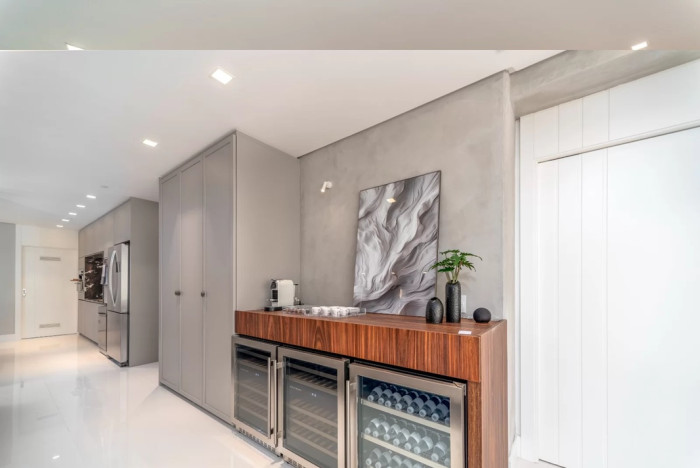Uma adega climatizada para mais de 100 garrafas, reflete o estilo de vida do espaço, enquanto o trabalho luminotécnico, garantem uma iluminação suave e refinada, essencial para a criação de um ambiente único e convidativo.