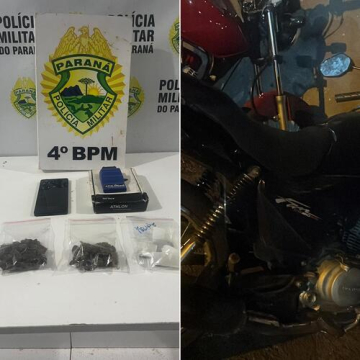 Fotos: 4º BPM Um adolescente de 16 anos foi apreendido pela Polícia Militar, em Maringá, após ser flagrado com entorpecentes e conduzindo uma motocicleta com sinais de adulteração. A ação ocorreu por volta das 22h30, durante patrulhamento ostensivo na Rua das Tipuanas.