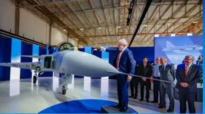 Lula e o primeiro Caça F-39 E Gripen montado no Brasil, no Aeródromo Embraer. - Ricardo Stuckert/PR A primeira aeronave caça F-39 Gripen supersônica fabricada no Brasil foi apresentada nesta quarta-feira (25), na capital paulista. De tecnologia sueca, a aeronave da Força Aérea Brasileira (FAB) é produzida pela empresa SAAB.
