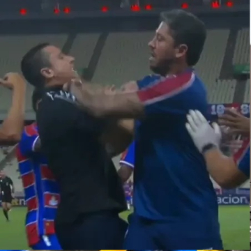 Nas imagens, um assistente do Cuiabá reclama com alguém do Fortaleza dizendo "Você me deu um soco na cara, rapaz".