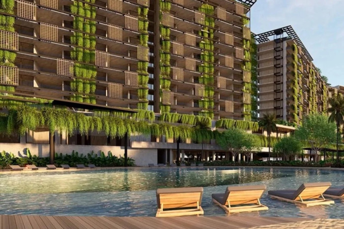 A página também destaca os principais atrativos do complexo: piscinas com borda infinita, aquaplay, toboáguas, pistas de boliche, spa, saunas, fitness center, sunset lounge club, bares, boutique e restaurante internacional. Segundo o material publicitário, o projeto prevê 220 apartamentos e 338 lotes de casas.