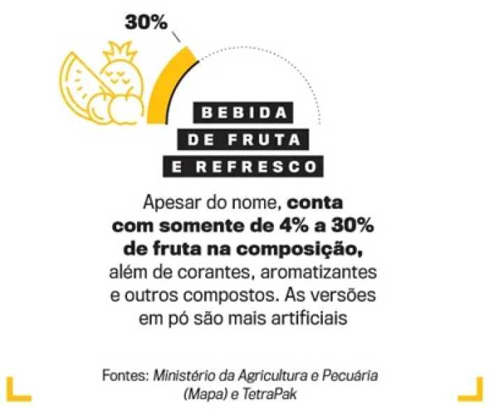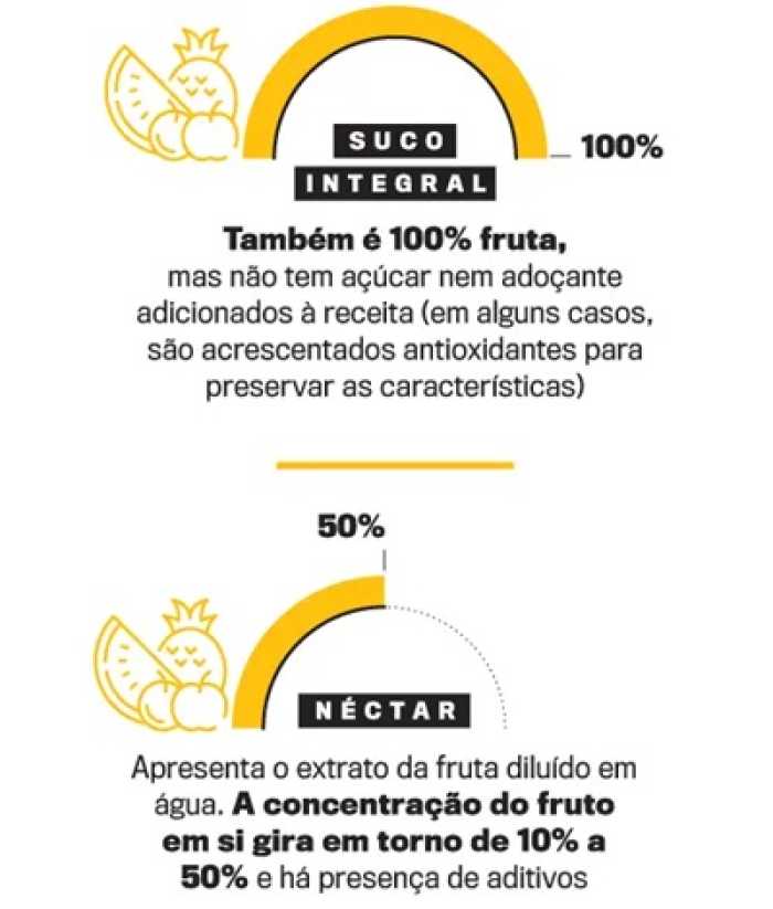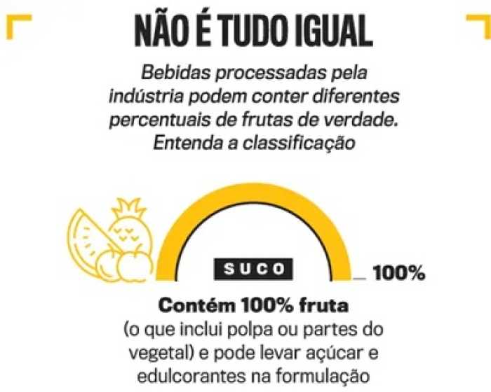 É importante destacar a expressão "100% fruta". Pois, além daquele que se faz em casa no espremedor, suco de verdade à venda no mercado é o que só leva o fruto, partes dele ou a polpa na receita.
