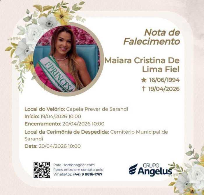 Além do título em Sarandi, Maiara também havia sido eleita Miss Londrina 2025/26, ampliando sua trajetória nos concursos de beleza. Ela era casada e mãe. O velório está acontecendo na Capela do Sistema Prever. O sepultamento está marcado para esta segunda-feira (20), às 10h, no Cemitério Municipal de Sarandi.