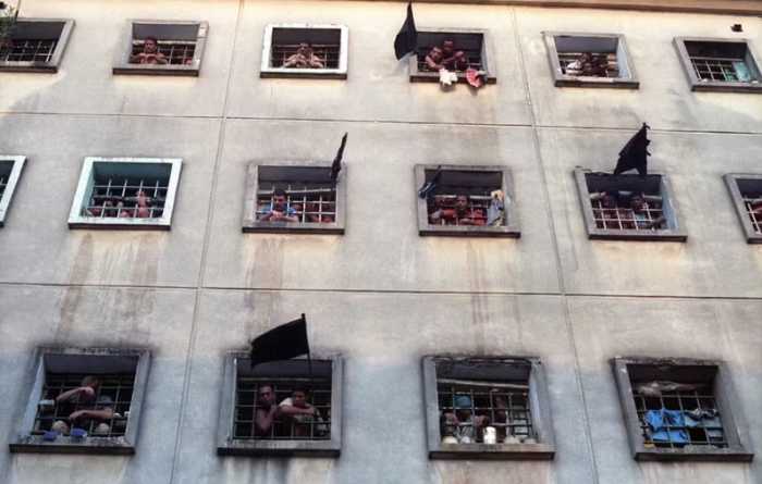 Bandeiras pretas de janelas de celas de Carandiru cinco dias depois do massacre de 2 de outubro de 1992 — Foto: Cláudio Rossi